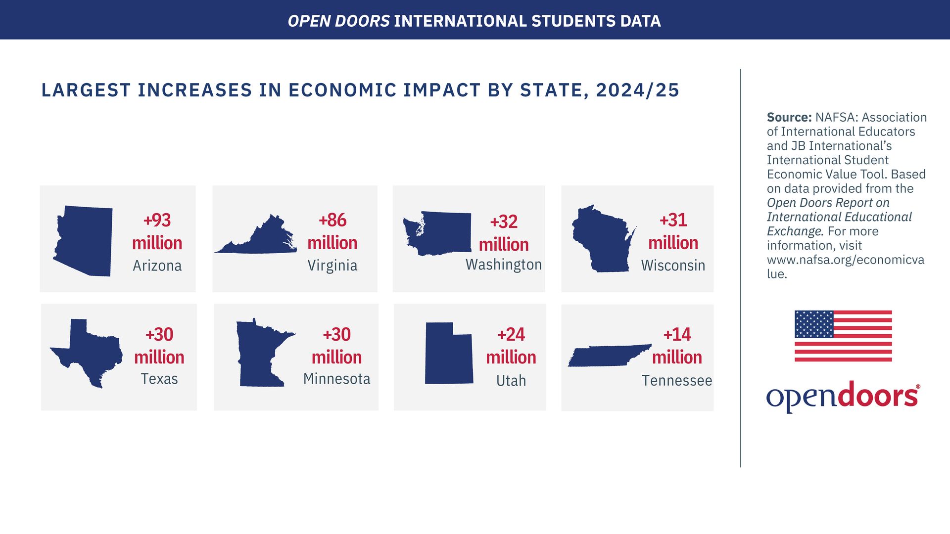 These declines matter — not just for college’s bottom lines, but for the broader economy. International students contributed $42.9 billion to the U.S. economy and supported more than 355,000 jobs last year, according to NAFSA.