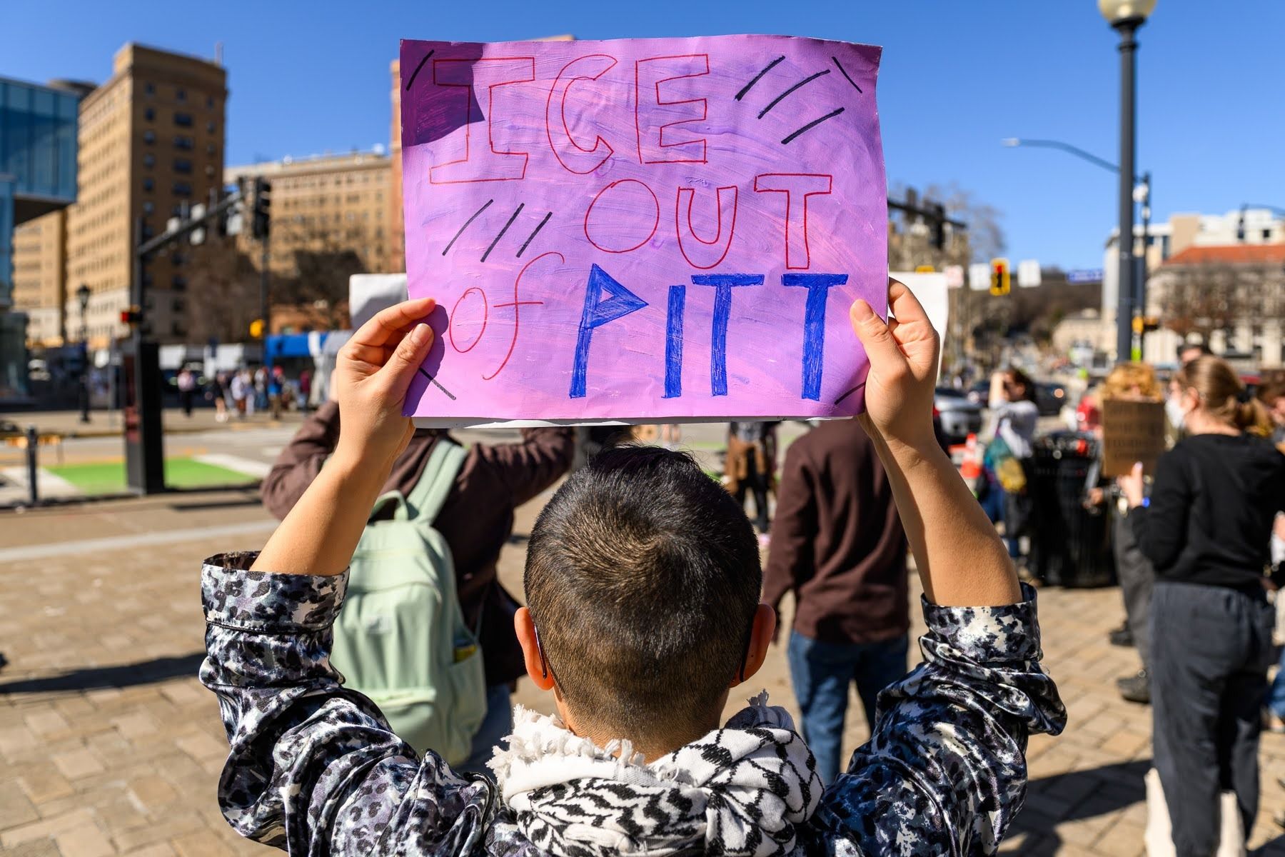 A demonstrator holds an anti-ICE sign during a protest at the University of Pittsburgh last week. (Alex Jurkuta/Pittsburgh’s Public Source)